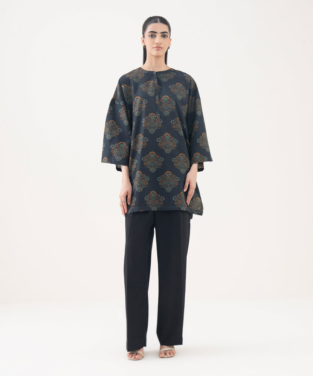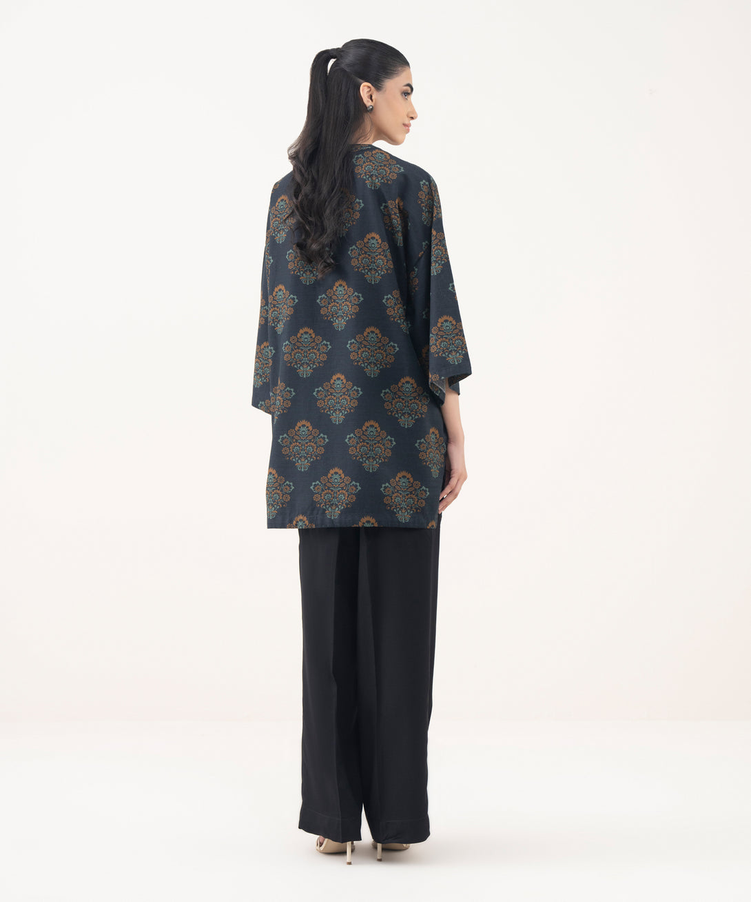 Upgrade your style in our printed dark blue light khaddar drop shoulder shirt featuring a band neckline with placket.