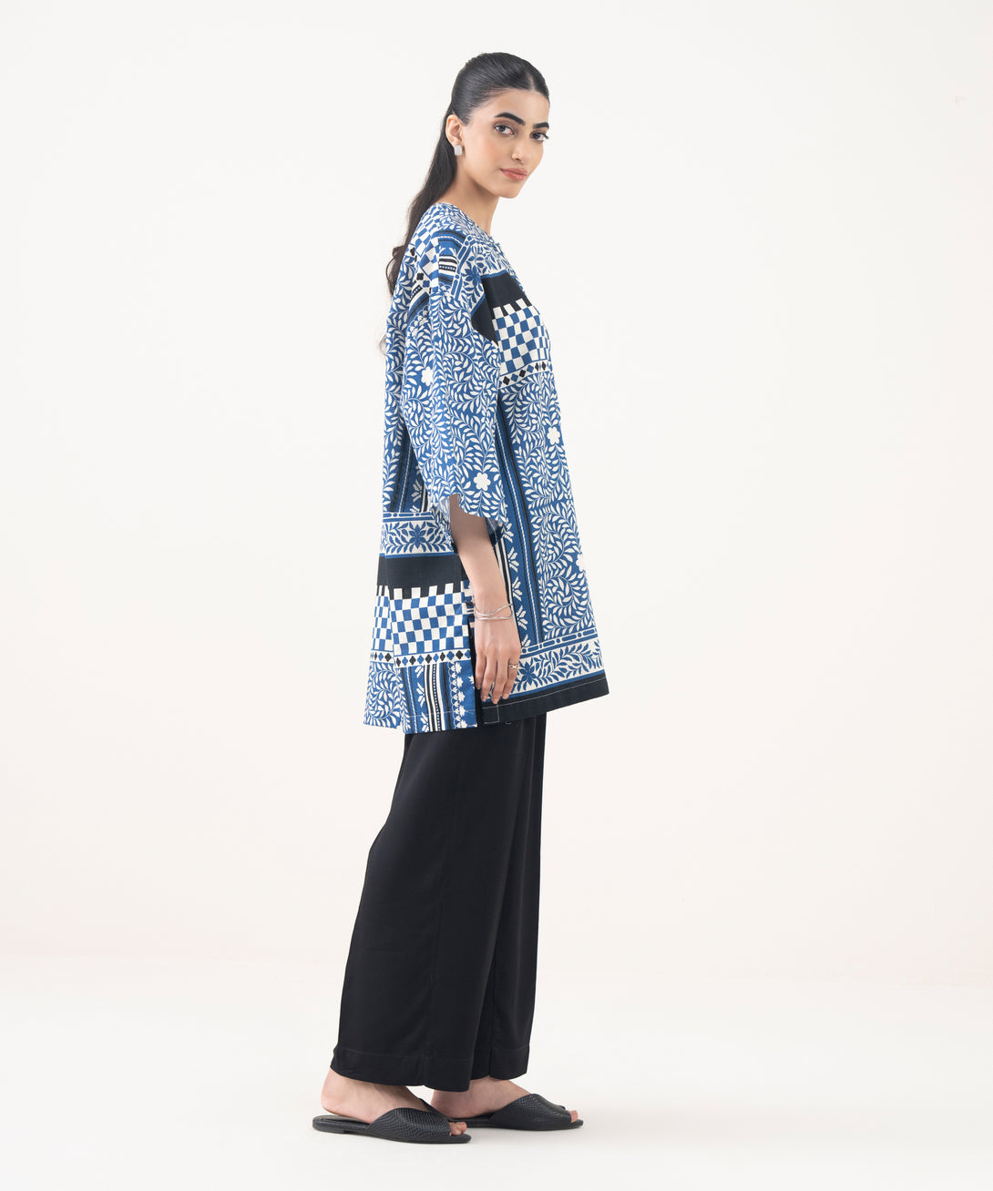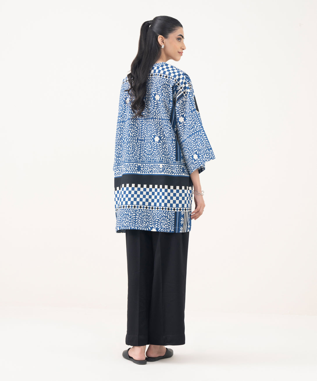 Upgrade your style in our printed blue light khaddar drop shoulder shirt featuring a band neckline with placket.