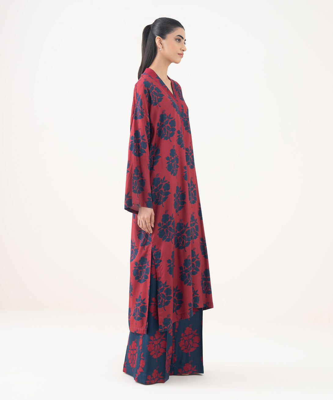 Upgrade your style in our printed red viscose linen drop shoulder shirt featuring a shawl style neckline.