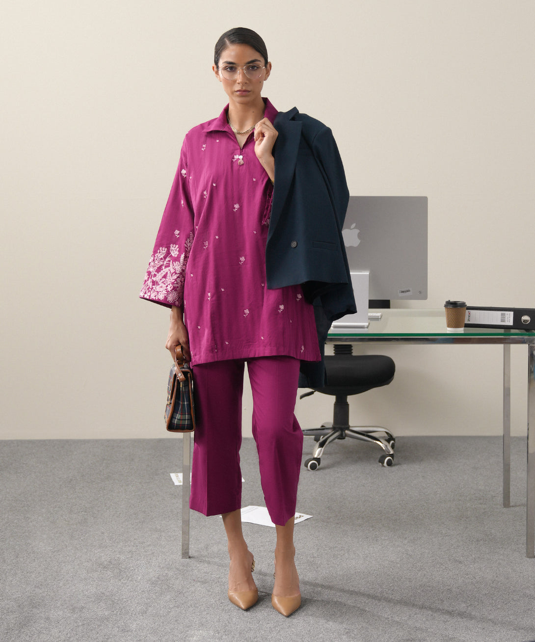 Step out in style in our embroidered purple textured lawn drop shoulder shirt featuring a collared neckline with slit .