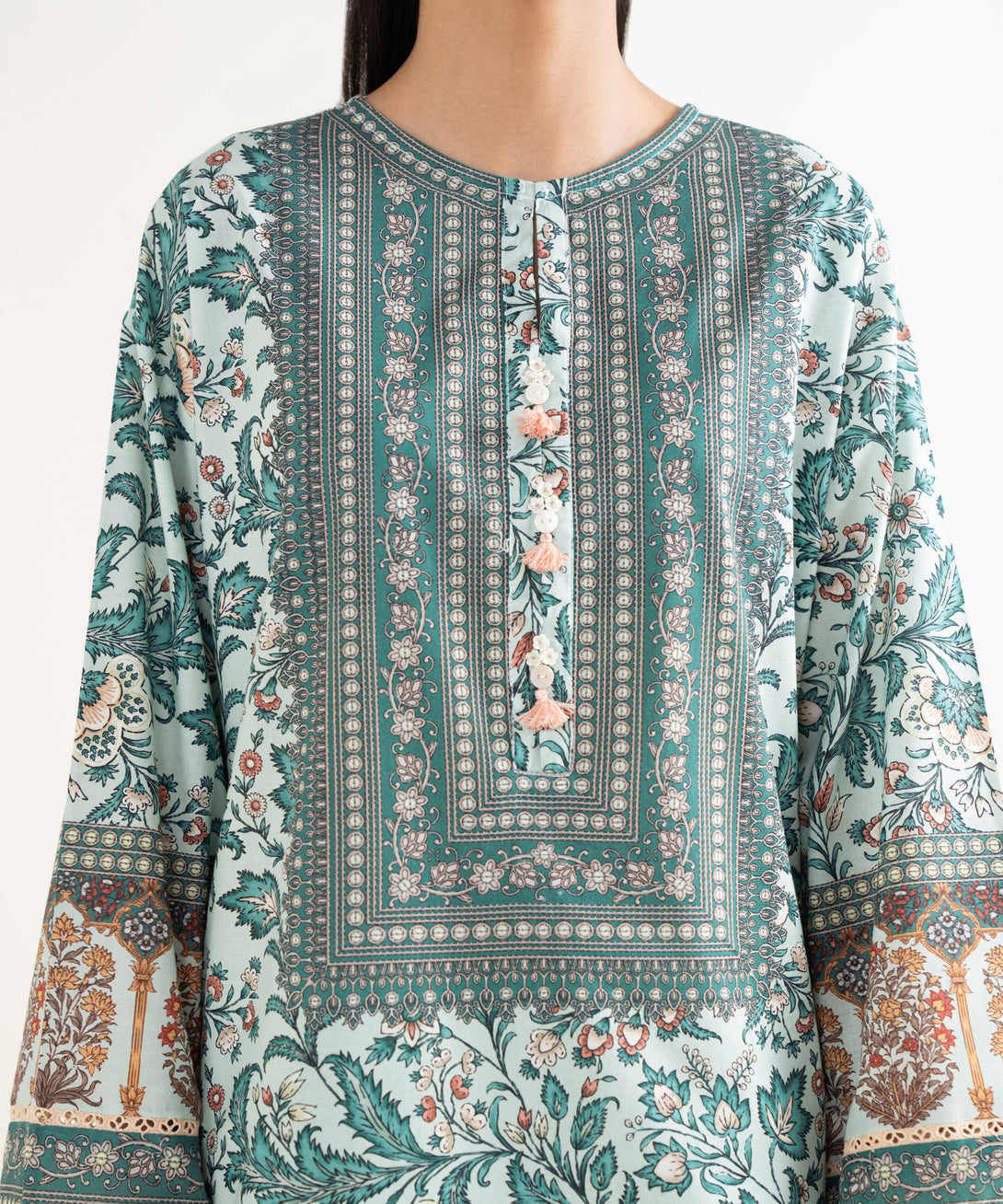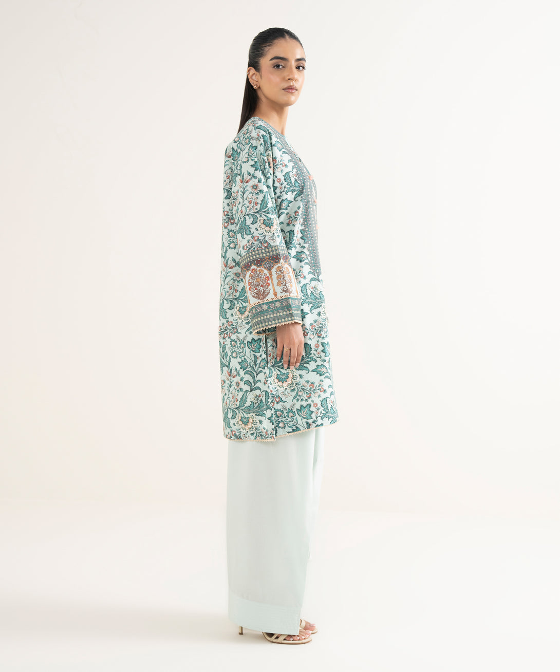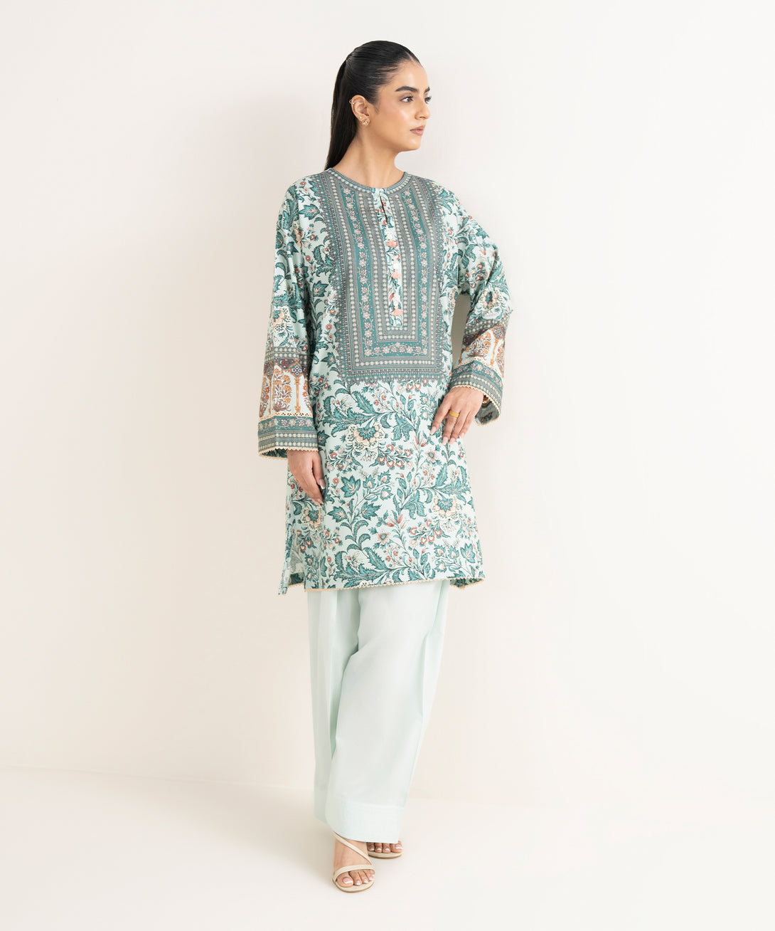 Printed With Lace Finish Front Panel, Printed Back Panel, Round With Slit Neckline, Full Sleeves, Short Length