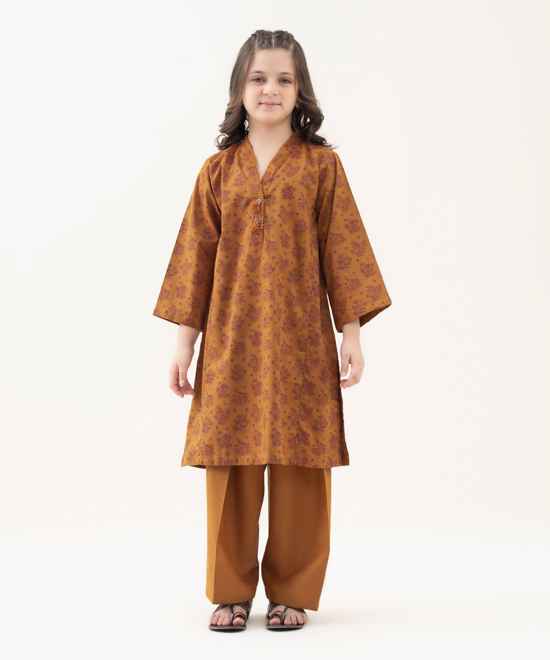 Dress your little one in our printed mustard cotton viscose A-line shirt and shalwar.