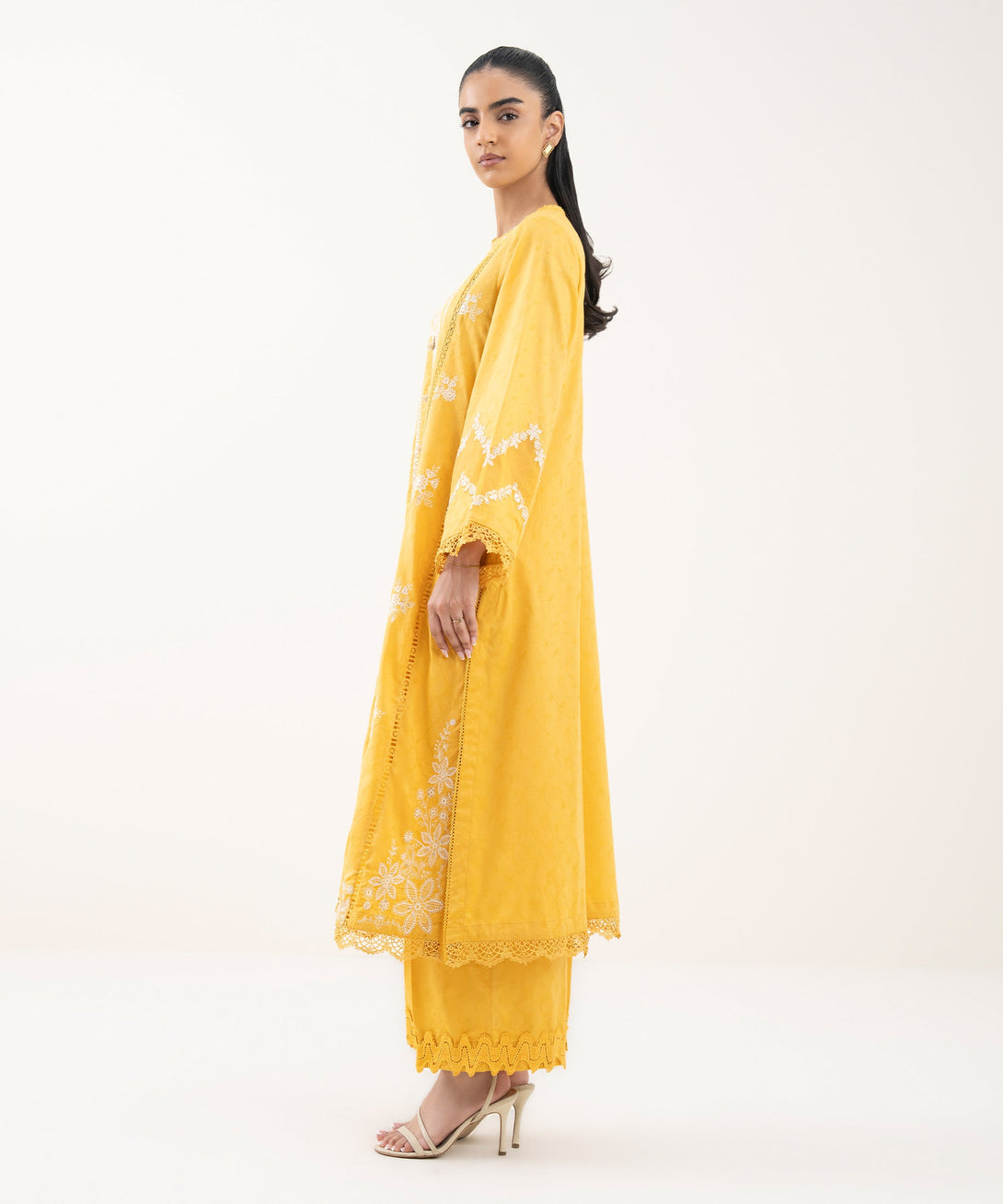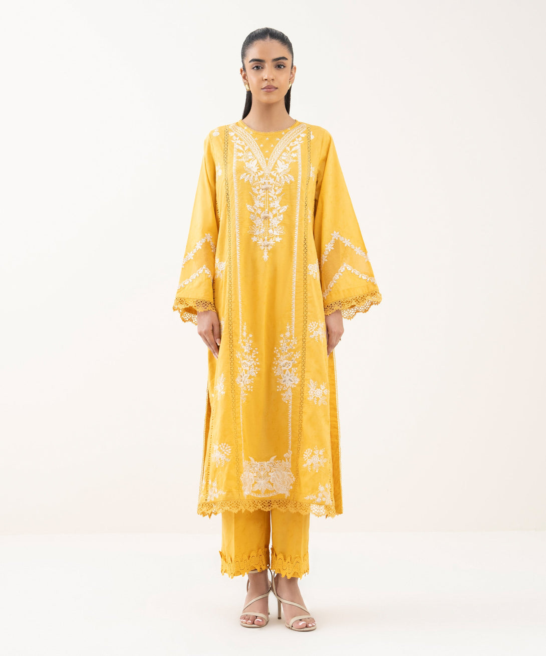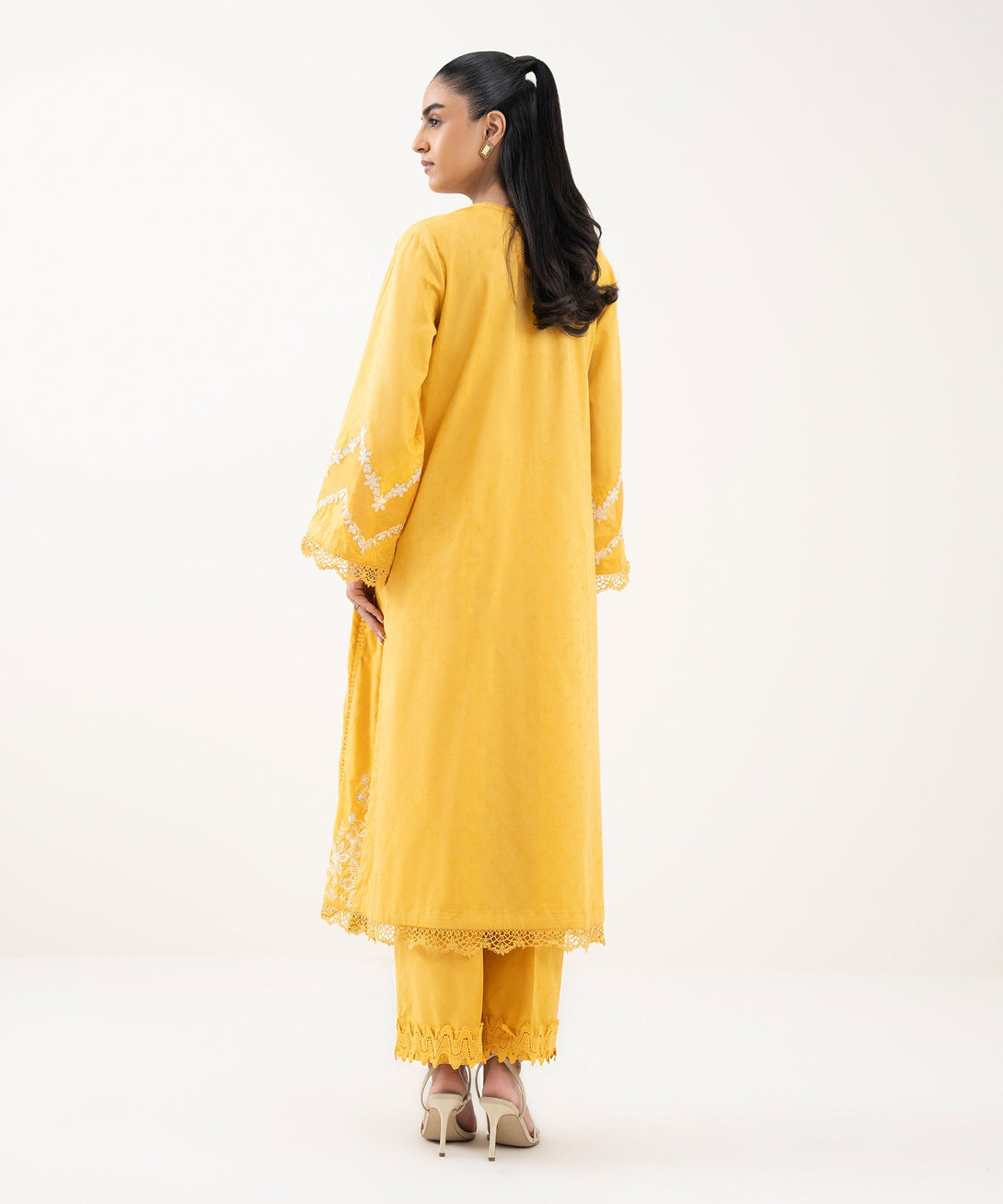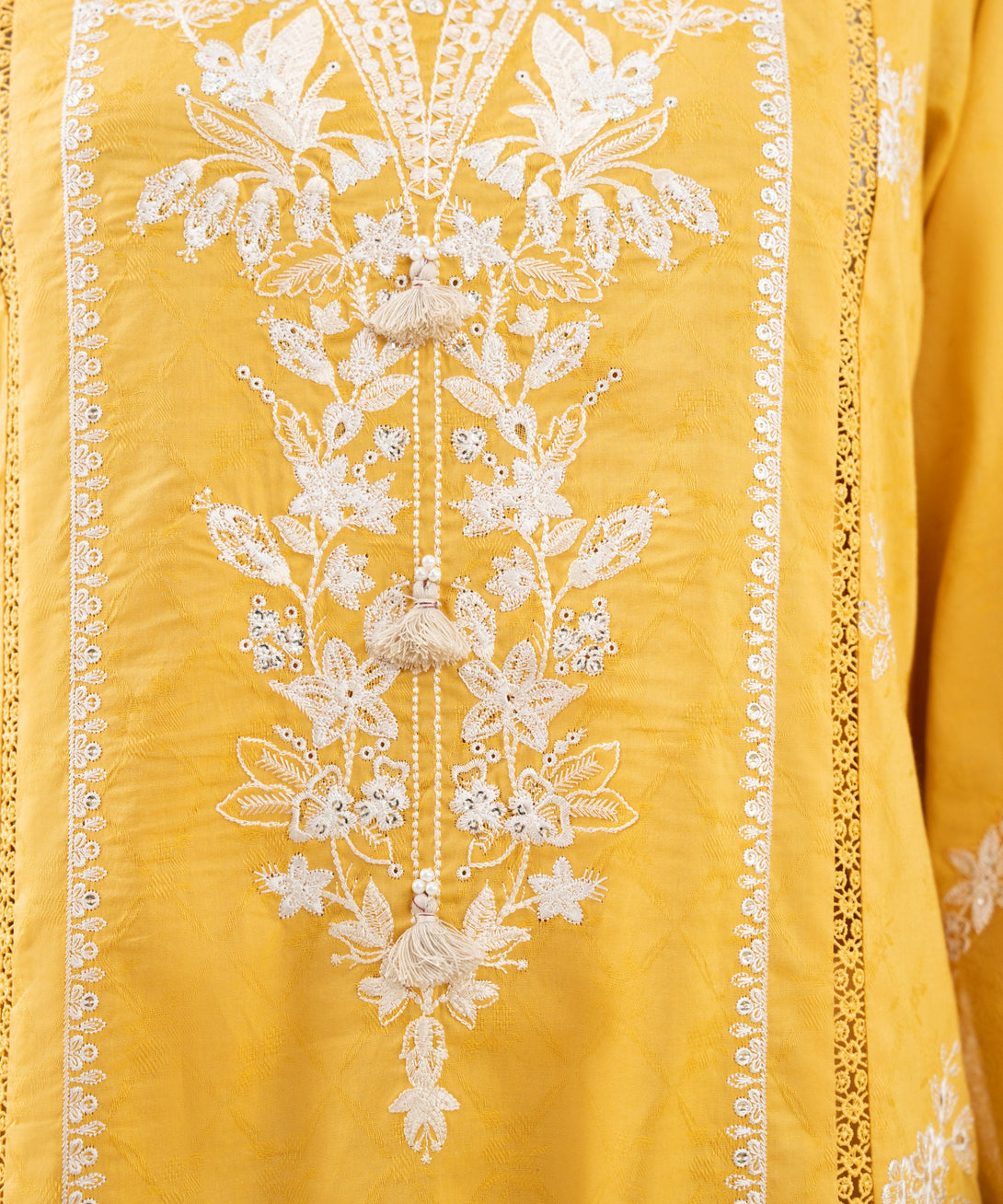 Upgrade your wardrobe with our embroidered yellow Self Jacquard A-line shirt featuring a round neckline.