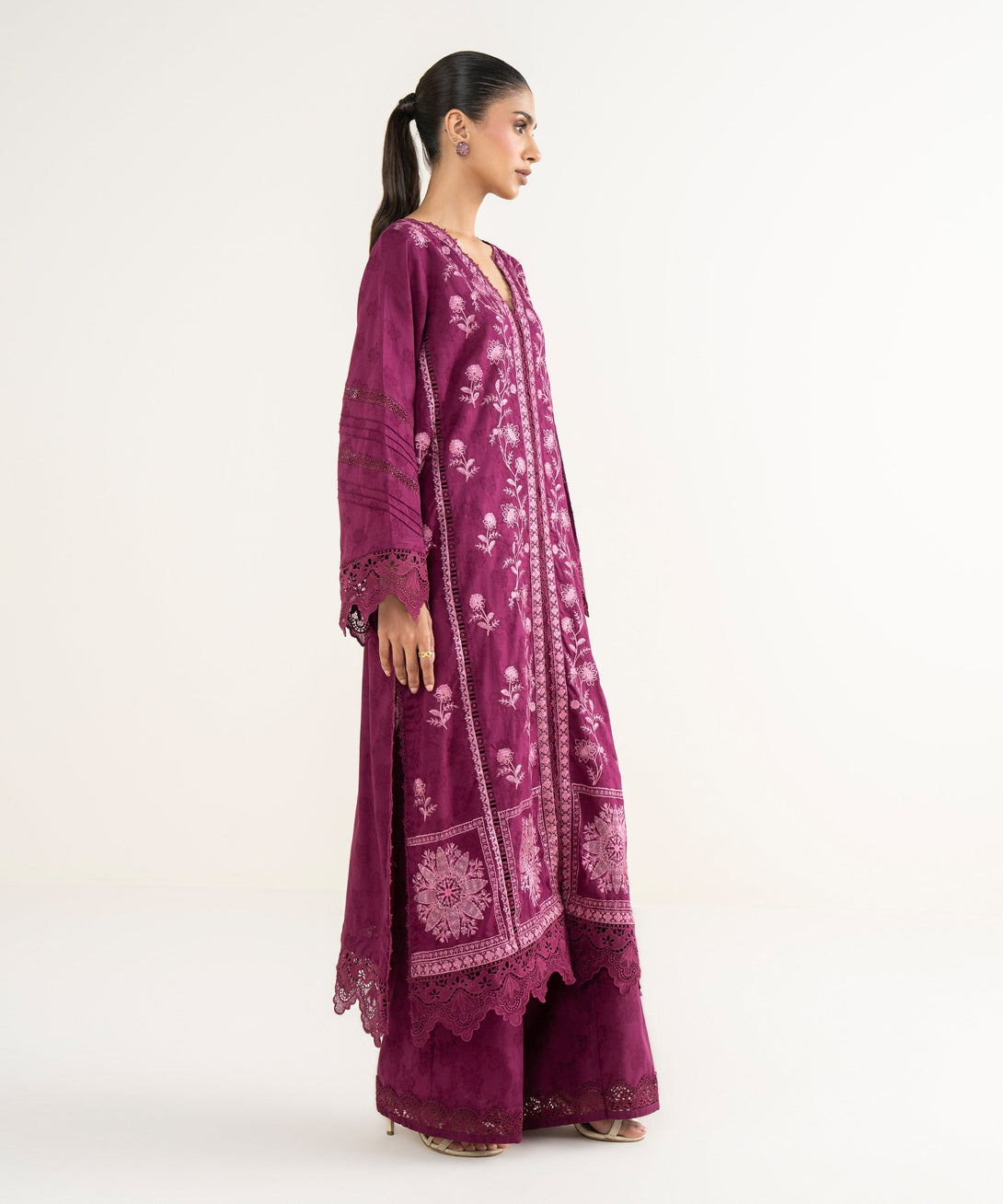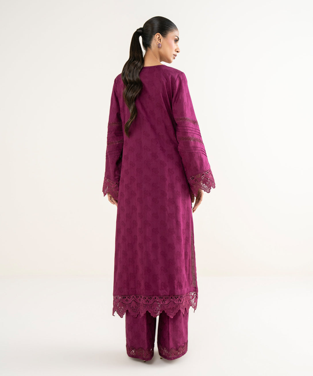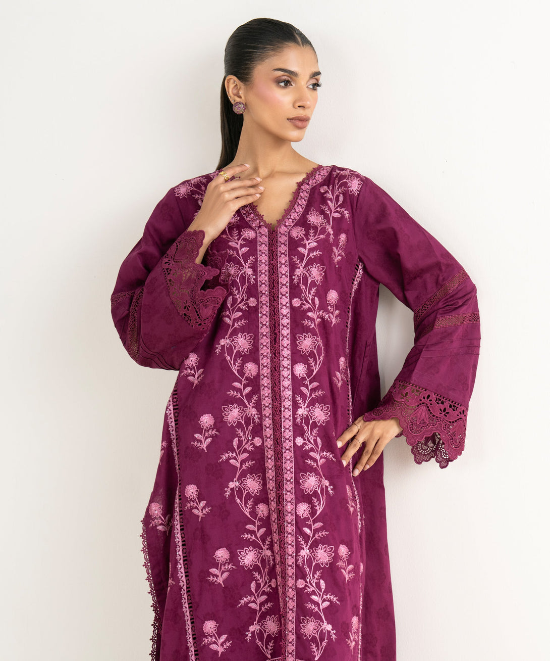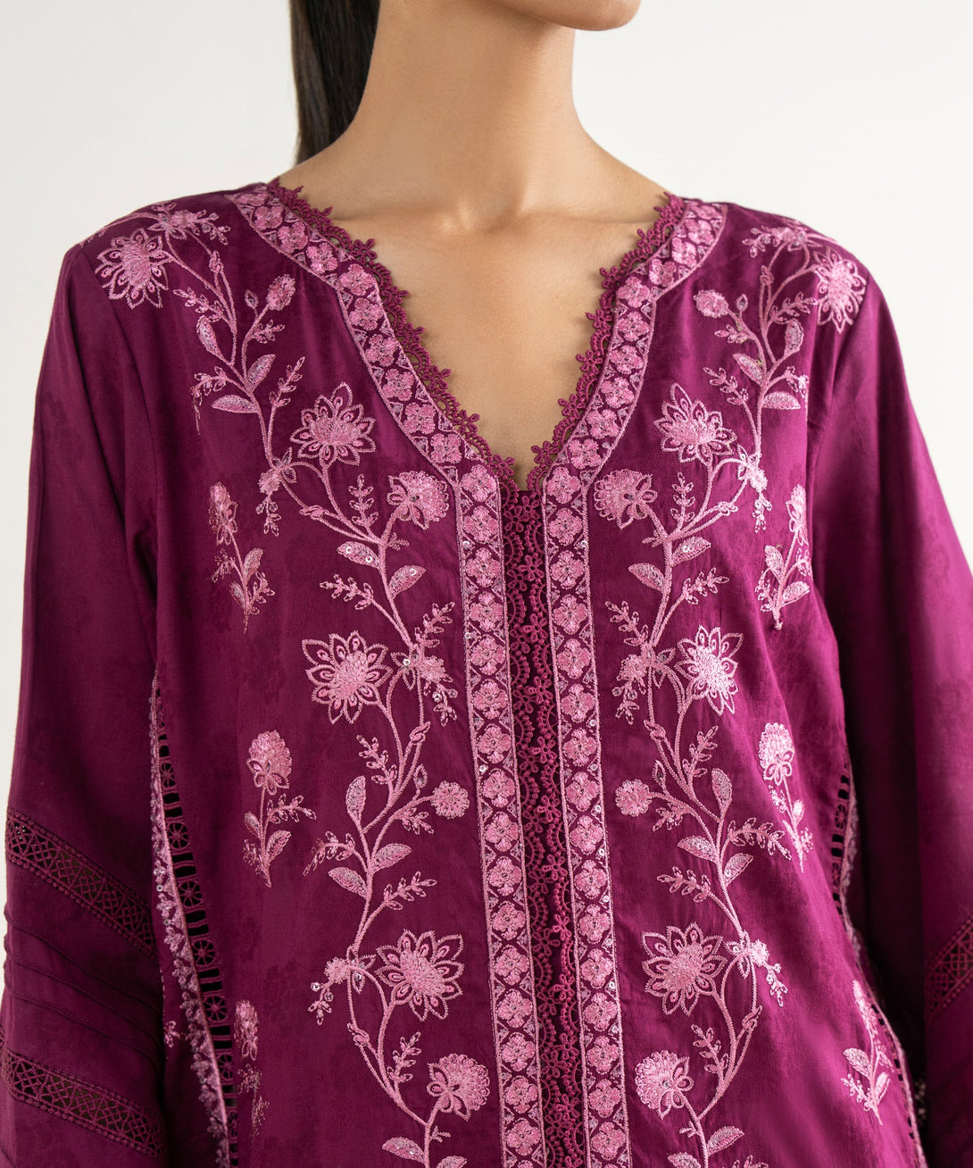 Upgrade your wardrobe with our embroidered purple Self Jacquard A-line shirt featuring a round neckline and slit.