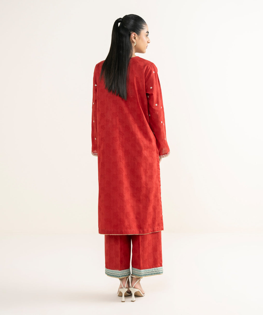 Upgrade your wardrobe with our embroidered red Self Jacquard straight shirt featuring a round neckline and slit.