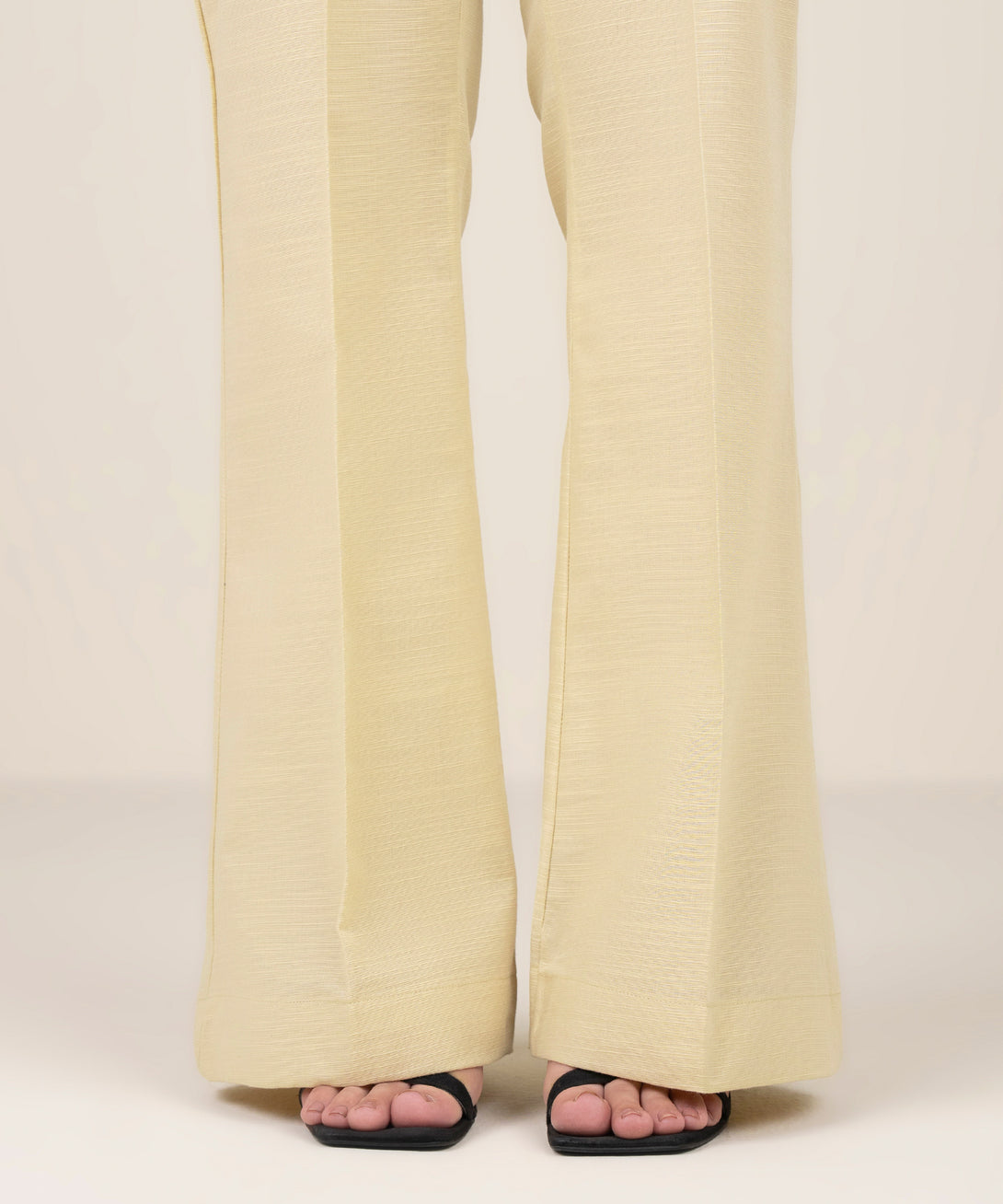 Step out in style in our dyed beige regular khaddar boot cut pants.
