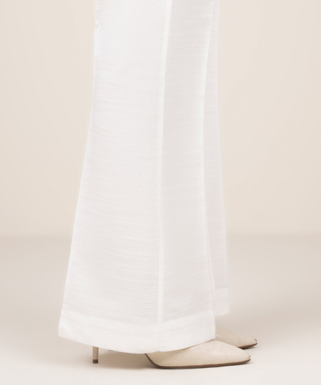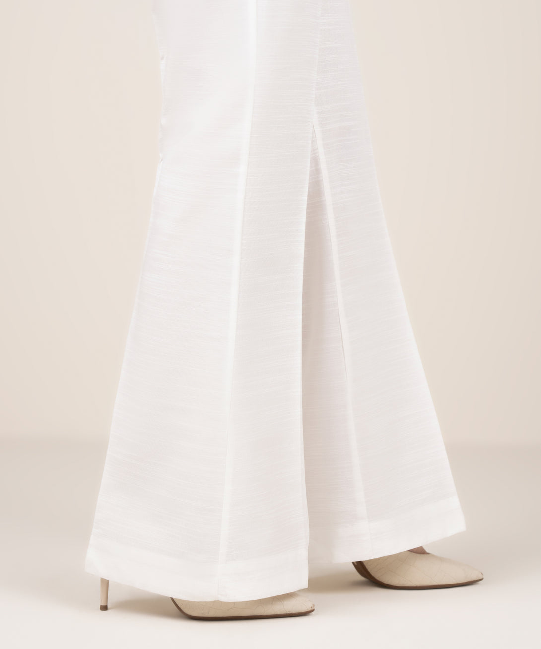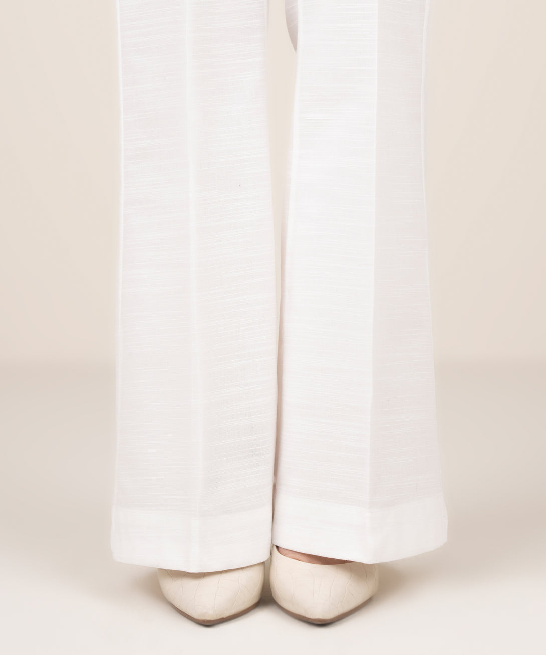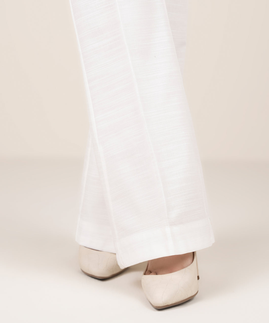 Step out in style in our dyed white regular khaddar boot cut pants.