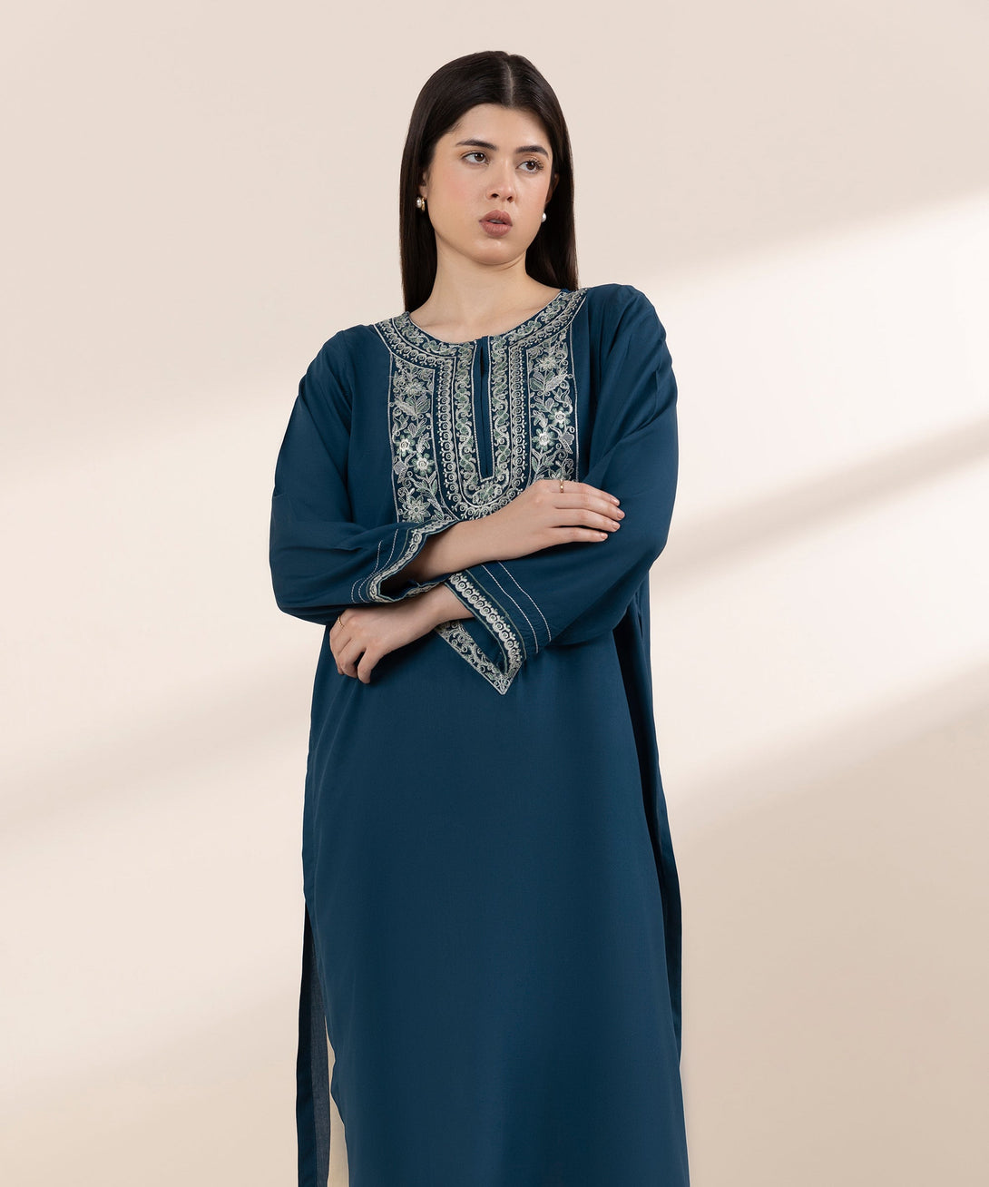 Dyed With Embroidered Front Panel, Dyed Back Panel, Round With Slit Neckline, Full Sleeves, Long Length