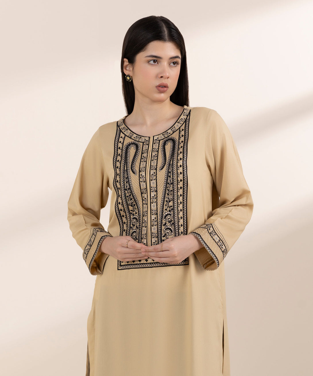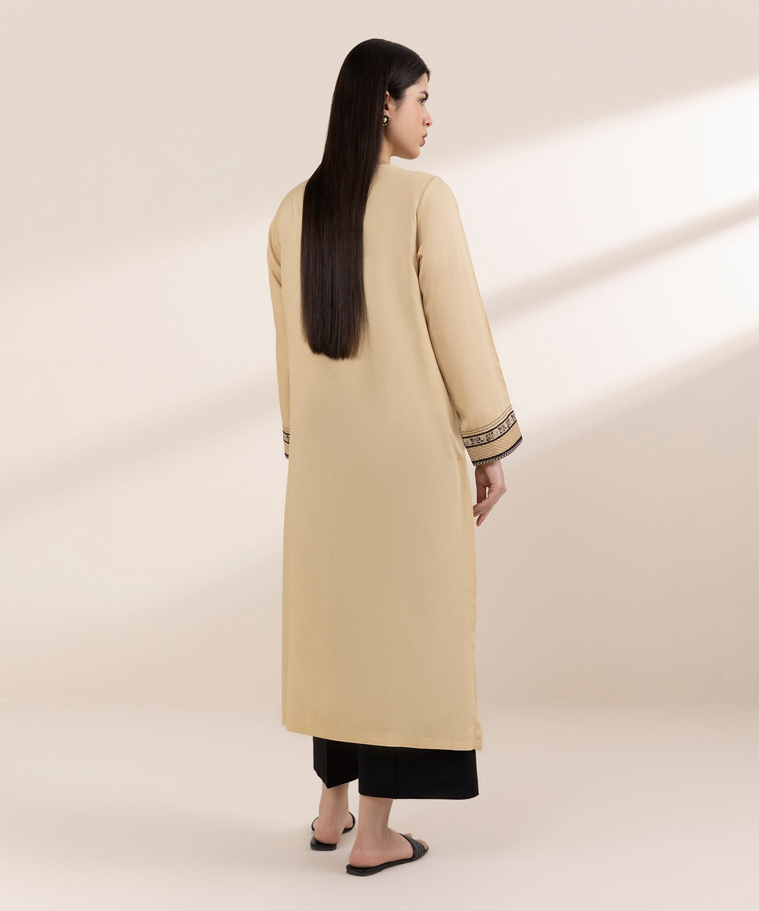 Upgrade your wardrobe in our embroidered arabic lawn beige A-line shirt featuring a round neckline with slit.
