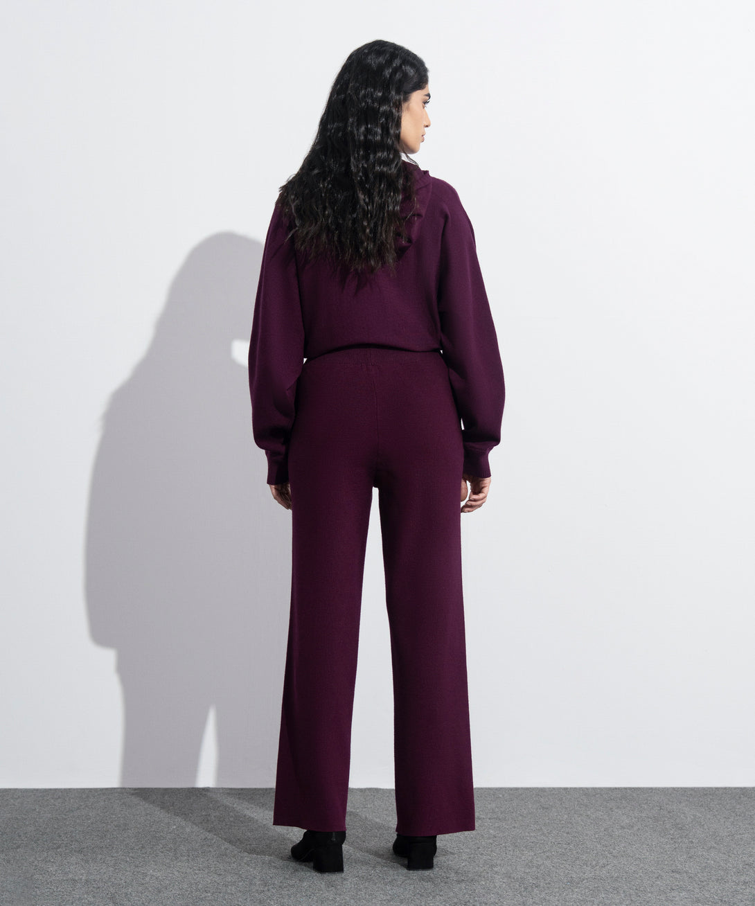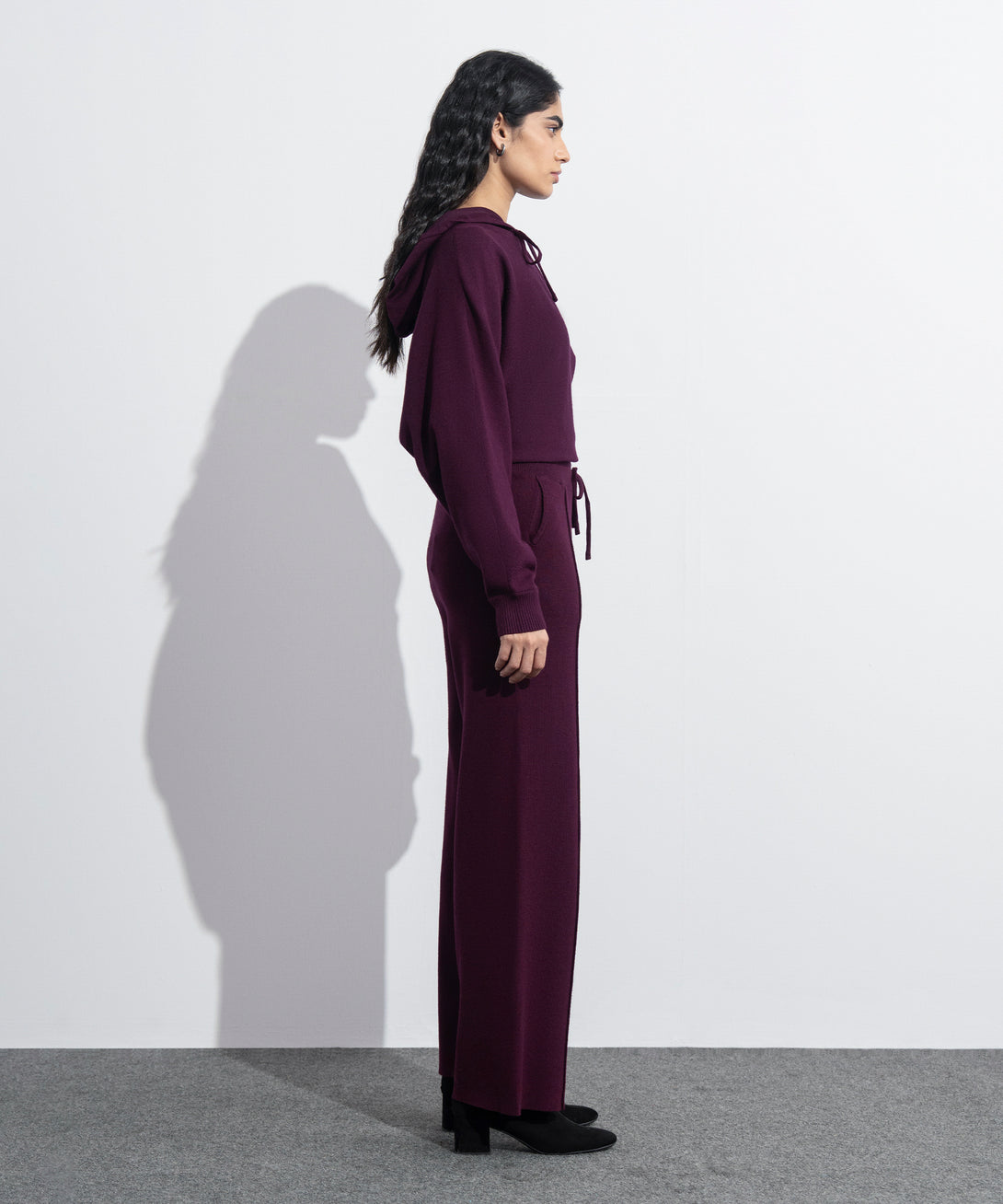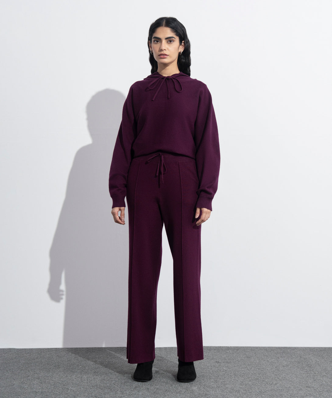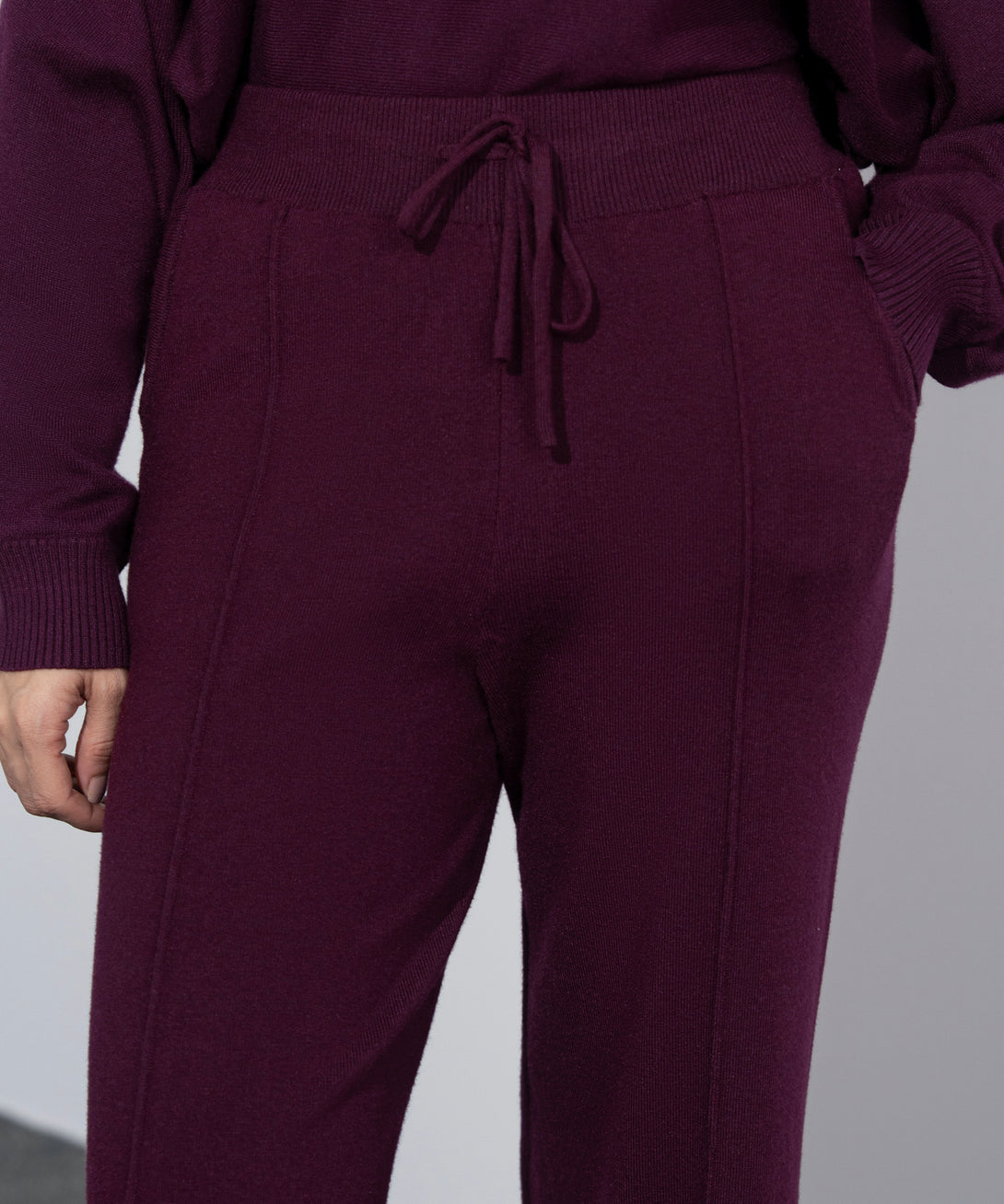 Pull-on long knit trousers in soft yarn. Ribbed waistband. Drawcord fastening. Front pintucks detail. Side slant pockets.