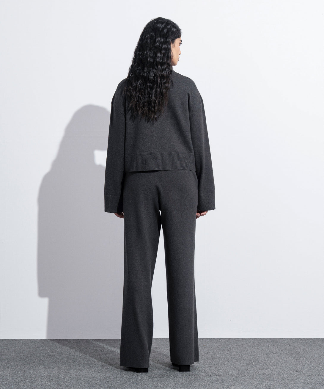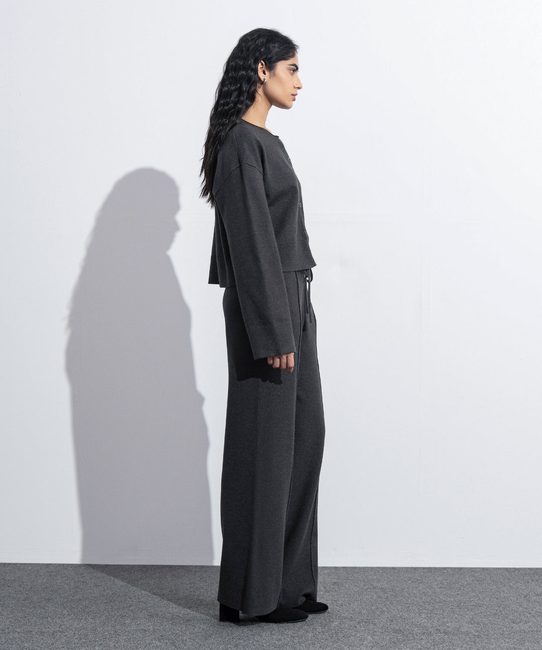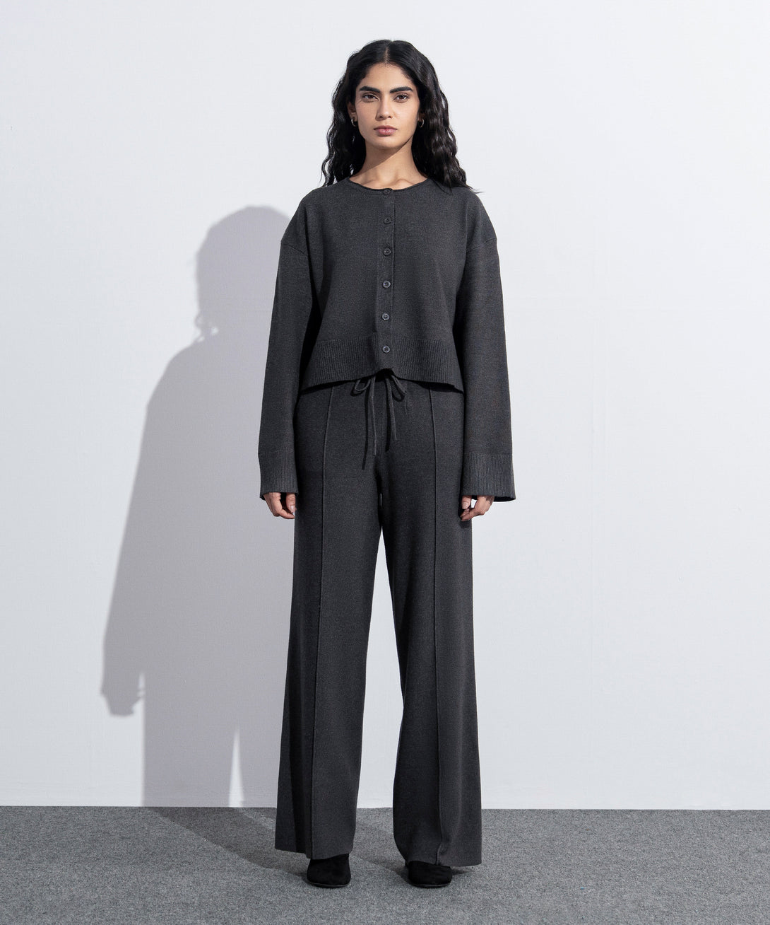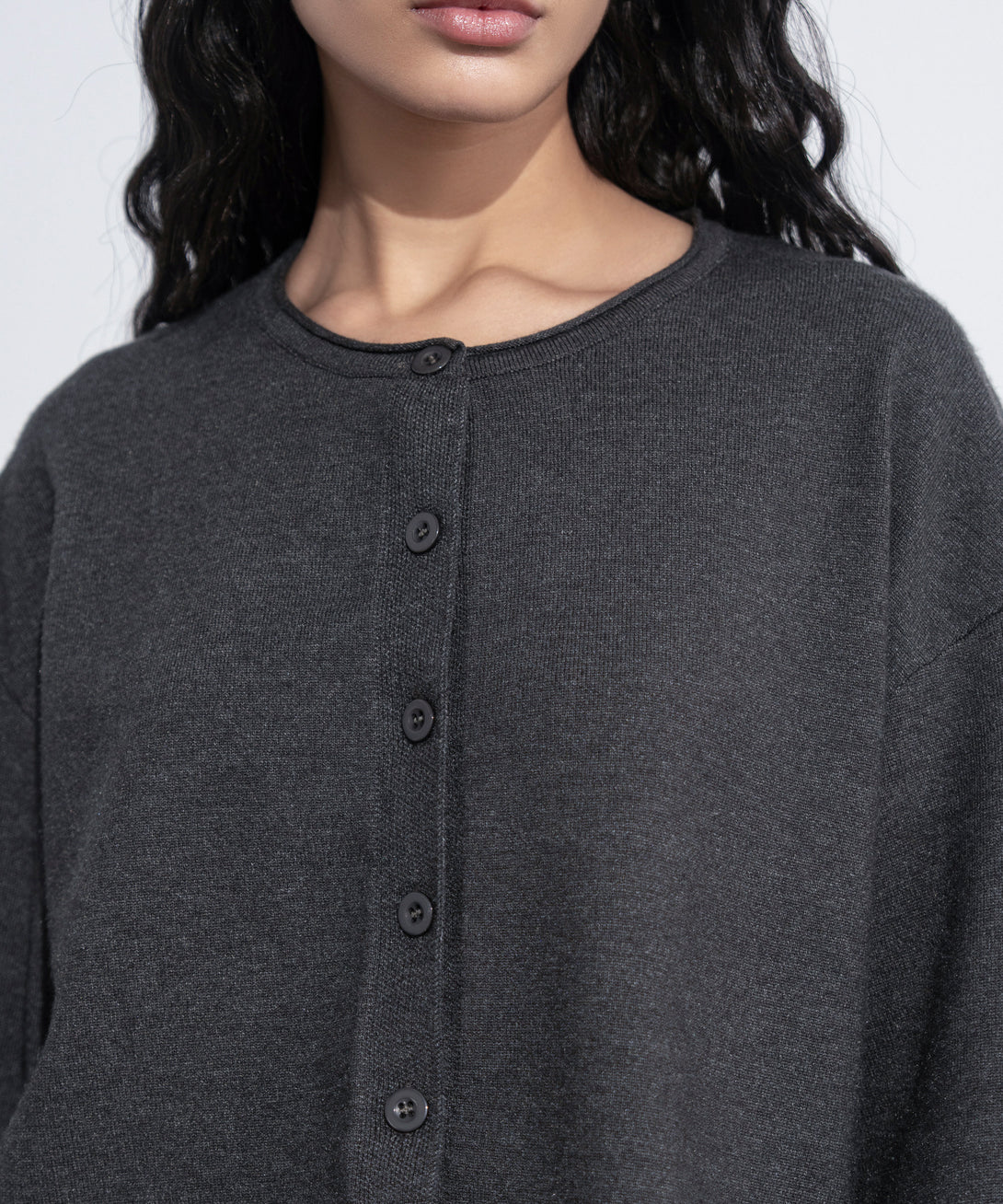 Cropped knit cardigan in soft yarn. Round neck. Full sleeves with rib cuffs. Ribbed hem details. Front button through fastening.