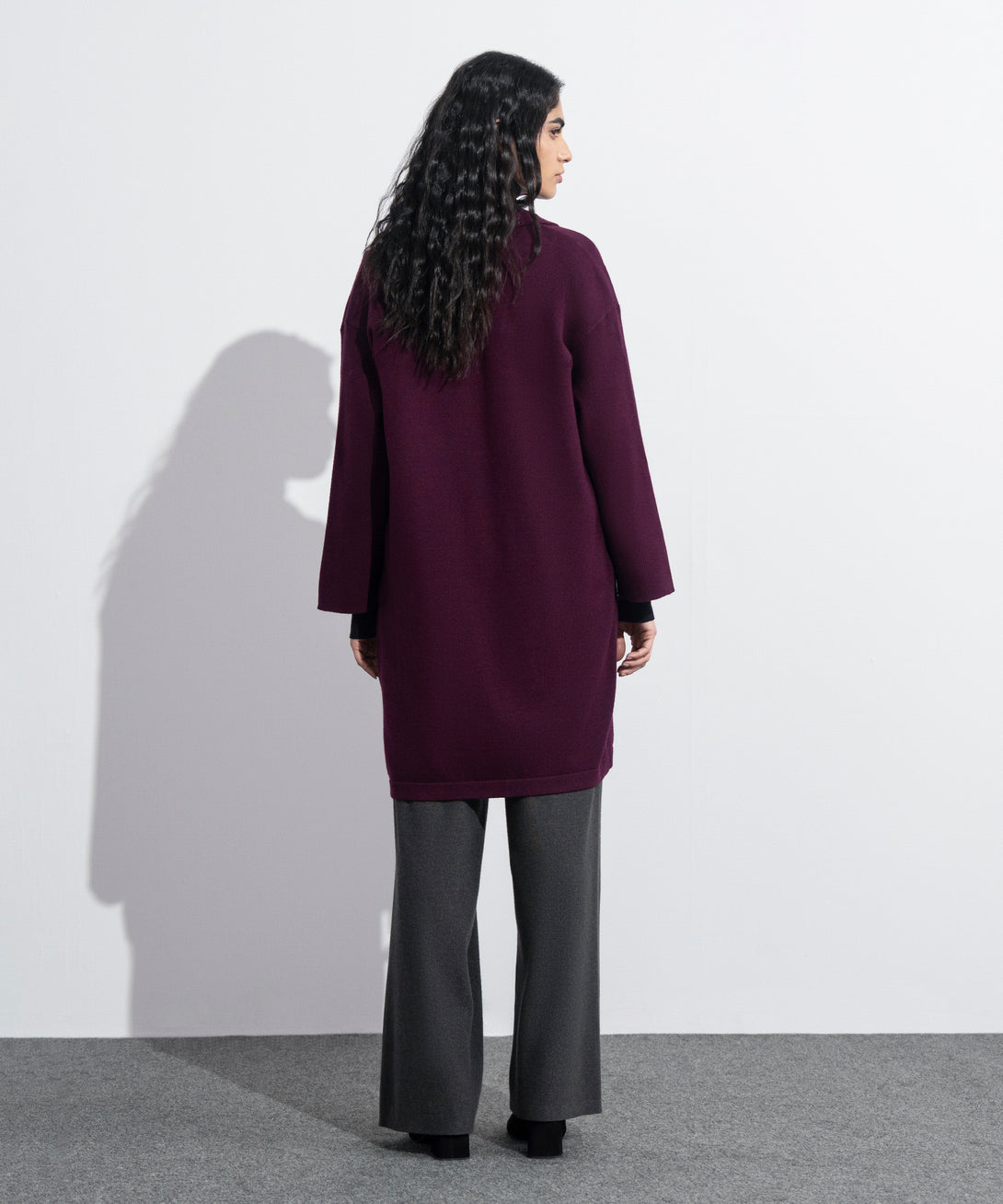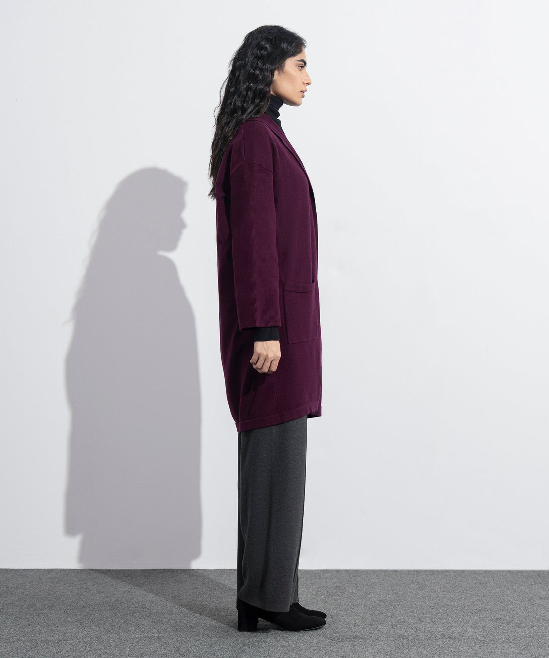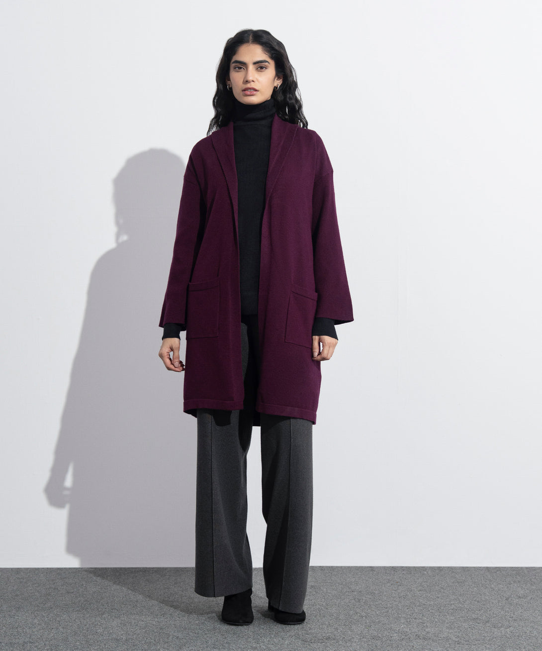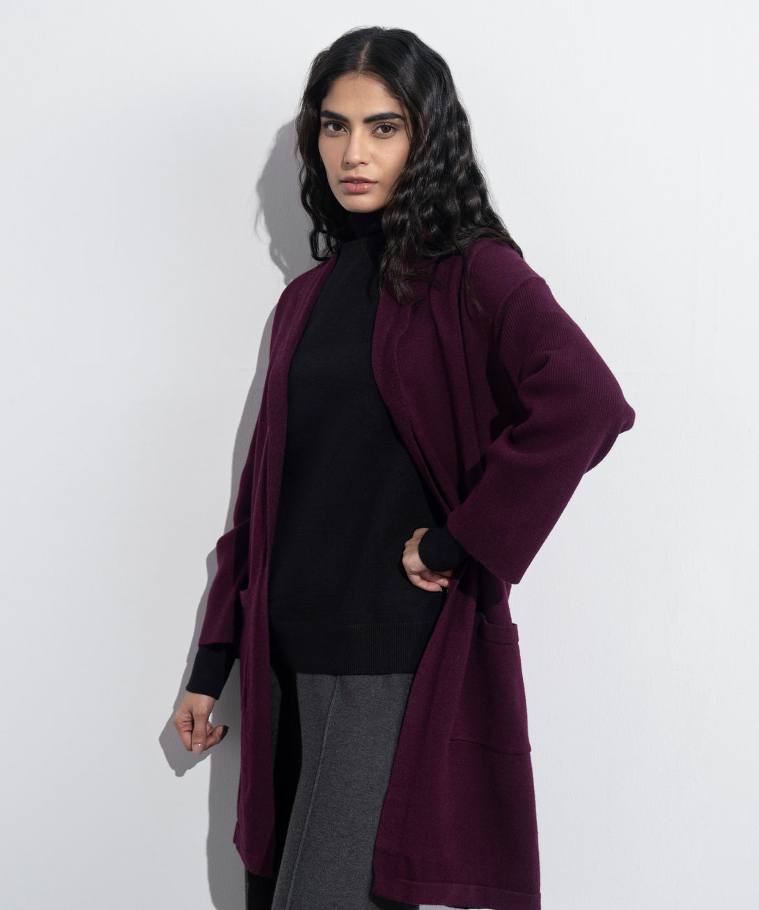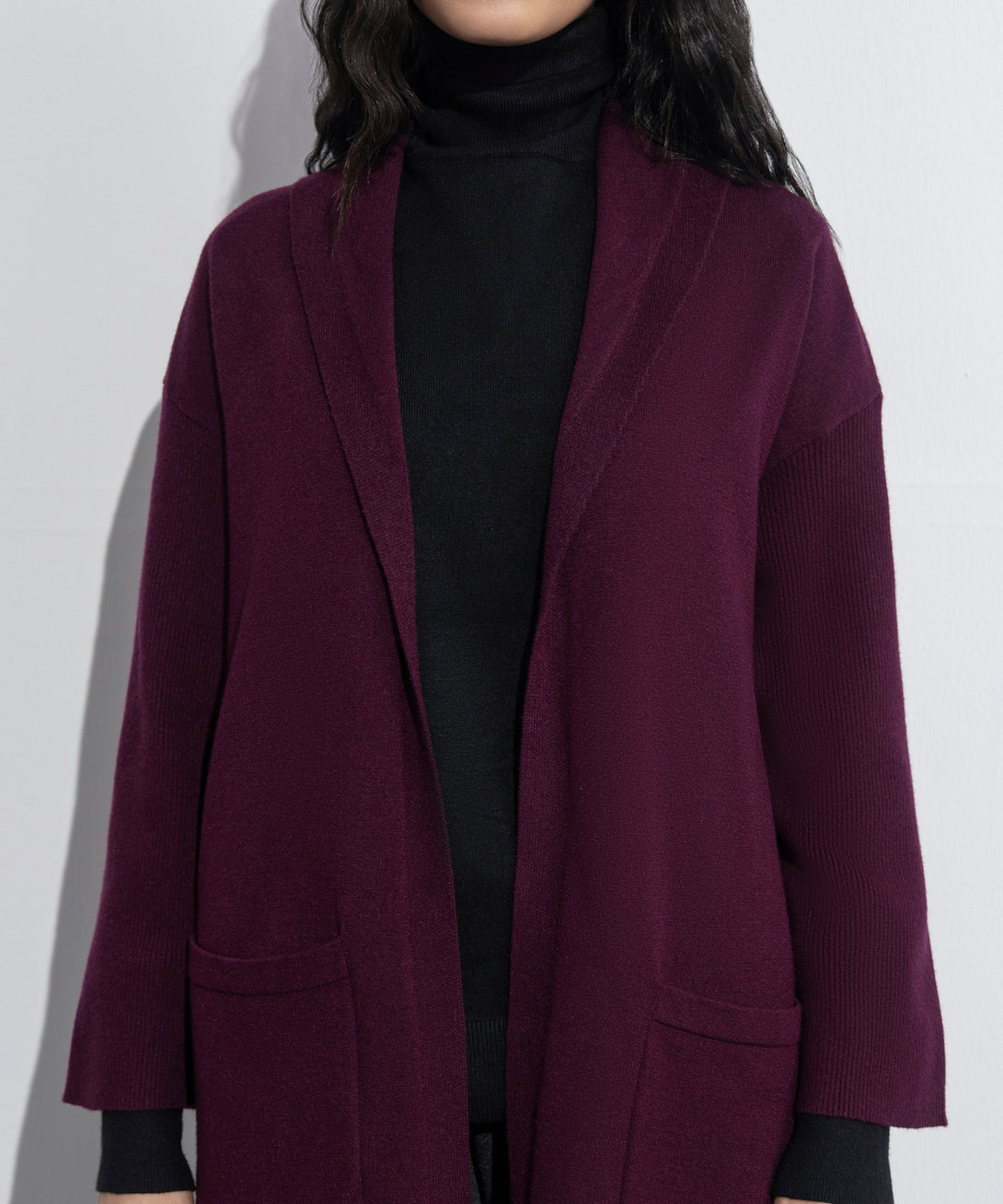 Long knit cardigan in soft yarn. Collared neck. Ribbed full sleeves. Patch pockets. Featuring front opening.