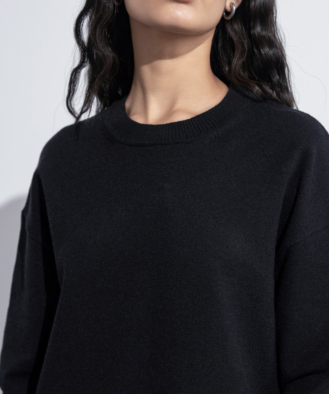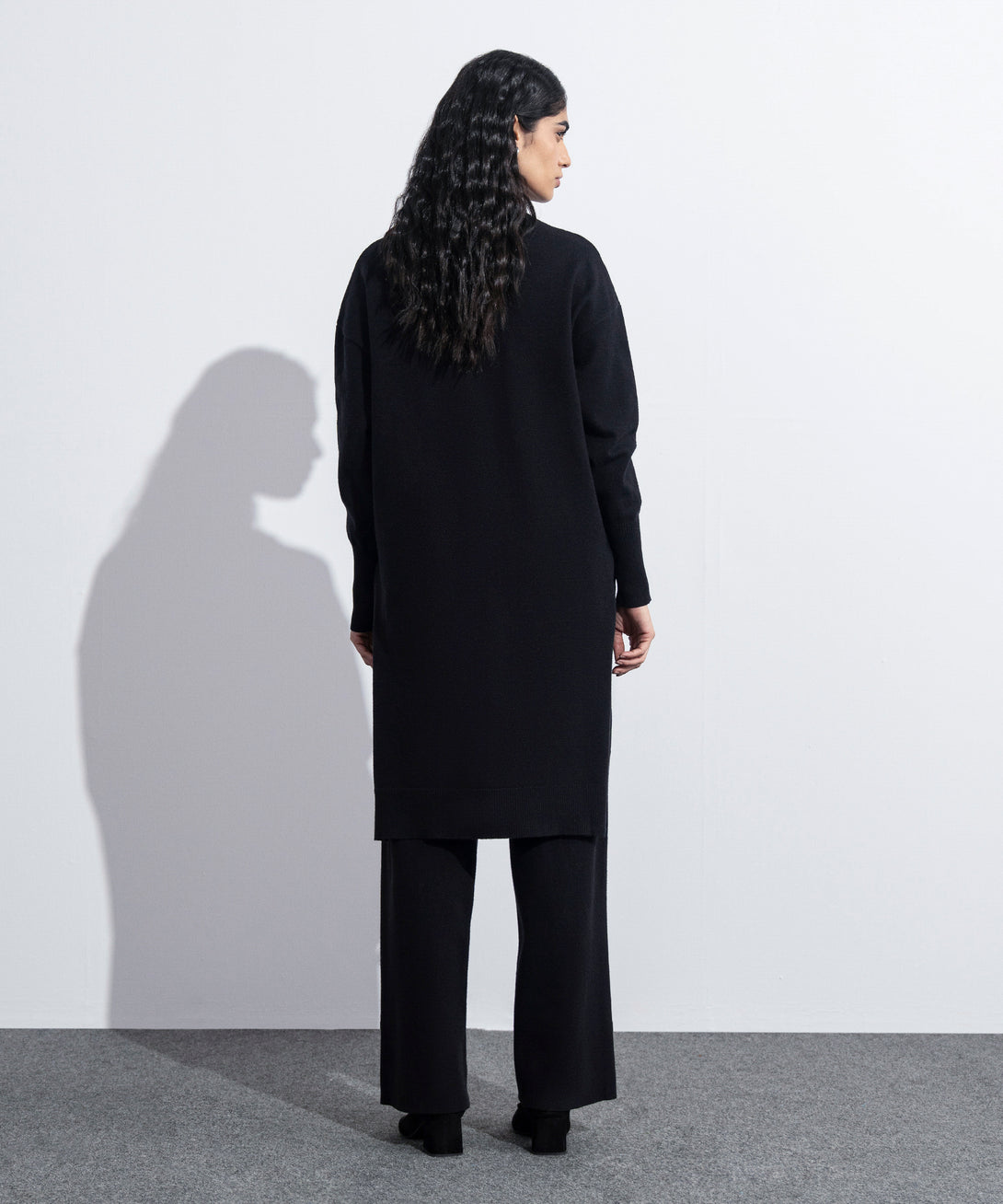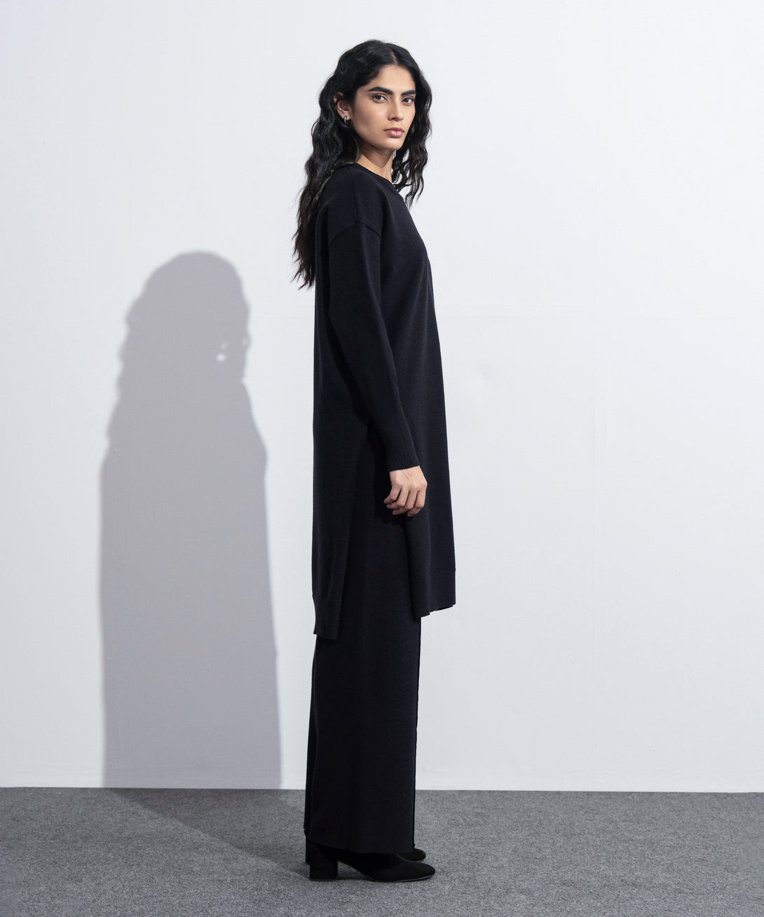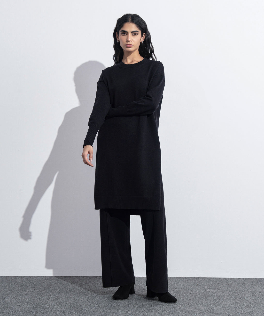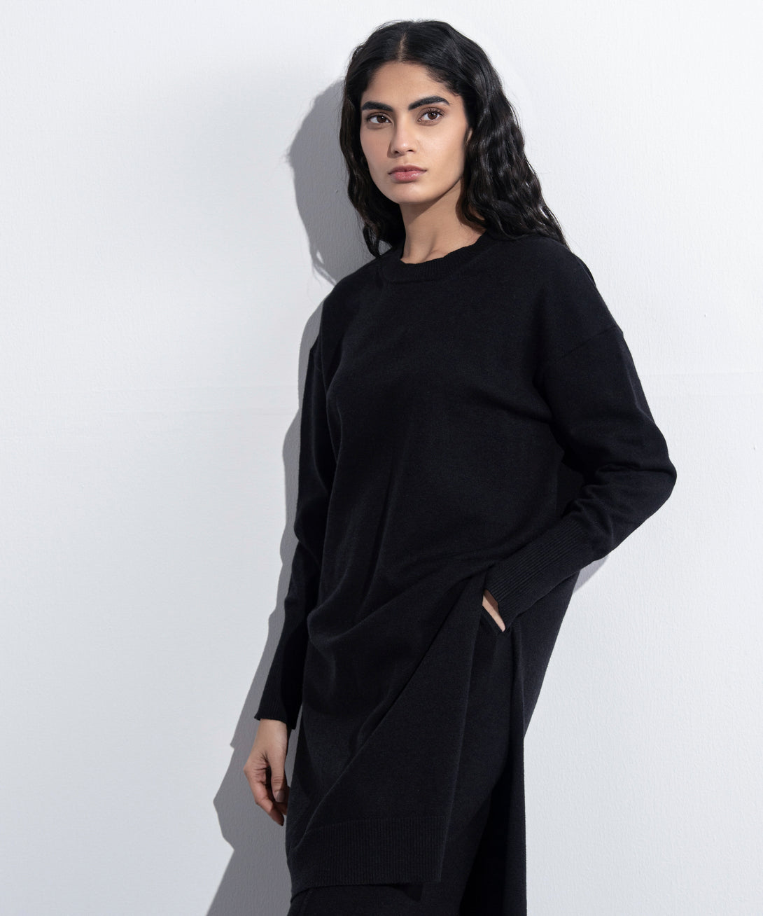Sweater knit long top in soft yarn. Round rib neck. Dropped shoulder. Full sleeves with ribbed cuffs. Ribbed hem. Side slit detail.